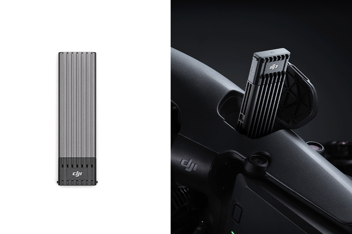 L’enregistrement se fait sur un SSD propriétaire inclus de 1TB, le DJI ProSSD 1TB, affichant un débit allant jusqu’à 1100 Mo/s en écriture et 900 Mo/s en lecture.