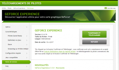 Bonjour, Il y a qqs temps déjà , une mise à jour Nvidia avait échoué chez moi avec l'OS Windos 7. J'ai découvert là, récemment, la disparition de GeForce Experience....et donc de l'application ShadowPlay bien pratique pour faire des captures d'écran (Bureau) comme pour faire un tuto par exemple. GeForce Expérience ne s'utilise pas avec toutes les cartes graphiques ...voir ici Configuration requise pour GeForce Experience | NVIDIA J'ai donc téléchargé la dernière version GeForce Expérience sur nvidia.fr Apres installation , j'ai obtenue un nouveau logo gris (!?) sur le Bureau et il s'ouvrait incomplètement, était inactif...bref, re-échec . Dans Nvidia Assistance, on retrouve des conseils pour tenter de régler ce problème et ainsi récupérer la dernière version GeForce Expérience: Mais en fait, la version Shadowplay a disparu avec GeForce Experience depuis la version 3.0, tout cela au profit des jeux: c'est donc une nouvelle application, Share, qui assure cette fonction capture d'écran : " Une nouvelle interface pour le partage de vos jeux en incrustation quand ils ne sont pas DirectX12 et quelques nouvelles fonctions comme l'enregistrement en 4K 60 images/seconde en plus de l'envoi direct sur YouTube et Twitch notamment en 1080p60 ! NVIDIA évoque également des concours qui seront proposés à travers le GeForce Experience pour faire gagner des clés de jeux sans que l'on ne sache si ces opérations seront réservées au seul marché américain... ou non. Et dans tous les cas GeForce Experience exige maintenant une connexion à un compte utilisateur Facebook, Google ou NVIDIA..." Ne m' intéressant pas aux jeux, mais seulement à la capture d'écran du Bureau, j'ai compris que je pouvais ré- installer GeForce Expérience 2.9. et je l'ai trouvé ici https://www.touslesdrivers.com/index.php?v_page=23&v_code=47895 J'ai d'abord désinstaller la version 3.5 de GeForce Expérience, car sinon Nvidia n'installe pas la version 2.9 Puis clic sur téléchargement sur touslesdrivers.com (opté serveur N°1) J'ai installé la version 2.9, retrouvé sur le Bureau l'ancien raccourcit (vert) et tout est rentré dans l'ordre. J'ai toujours pour la carte graphique le dernier pilote du moment GEFORCE GMD 381.65 etc ... Par contre: - il faut que l'OS W7 utilise un thème Aéro (Panneau de configuration/Apparence et personnalisation /Personnalisation) pour que la capture du Bureau se débloque.... - sur les portables cela ne marche pas, mais il existe un tuto pour contourner le problème apparemment. - Dans GEFORCE Expérience, cocher "me demander avant toute MAJ" sinon on repartira vers la dernière version et rebelote... : toutefois j'ai eu au redémarrage une mise à jour, mais conservation de la version GEFORCE EXPERIENCE 2.9 Apres ceux qui veulent absolument Share et qui arrive à installer GeForce dernière version, il peuvent soit suivre les indications de Nvidia Assistance citée plus haut et récupérer Share ... Mais bon même là, c'est pas gagné d’après ce tuto sur You Tube... quand on lit les commentaires On peut , si on a toujours un échec pour installer la dernière version GeForce Expèrience (Share) passer par un nettoyage avec CCleaner voir ici Échec du programme d'installation NVIDIA (Drivers) (Résolu) Bon travail... Nb: Apparemment SHARE n'a pas la même fonction que SHADOWPLAY et donc ceux qui ont opté pour les dernières cartes NVIDIA ne peuvent pas revenir à GEFORCE EXPERIENCE 2.9.... voir ici NVIDIA SHARE ? | Le Repaire